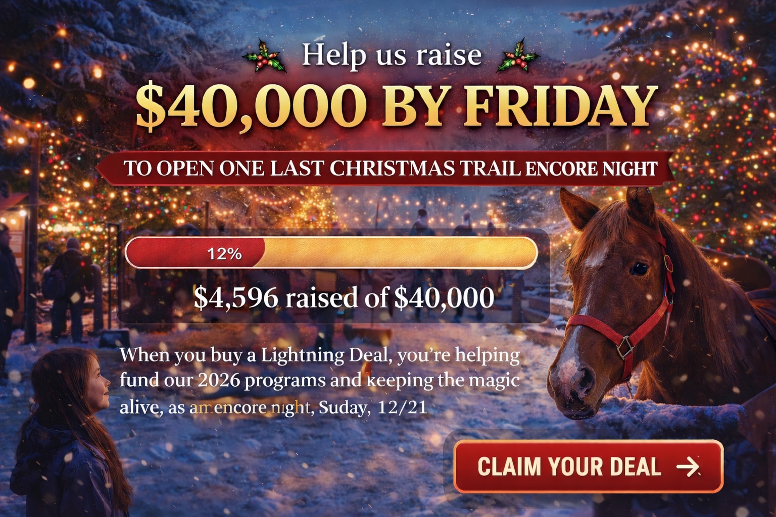 We have received so many requests to open up the Christmas Trail one more time, but we can only do it once we’ve secured what we’ll need to be successful in the coming year. If we reach our goal, we’ll open the Christmas Trail for one final encore night, Date & Time: TBA.